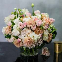 Price: $175.00Romantic Beige & Pink Floral Arrangement in Glass Vase – Beverly Hills Florist
